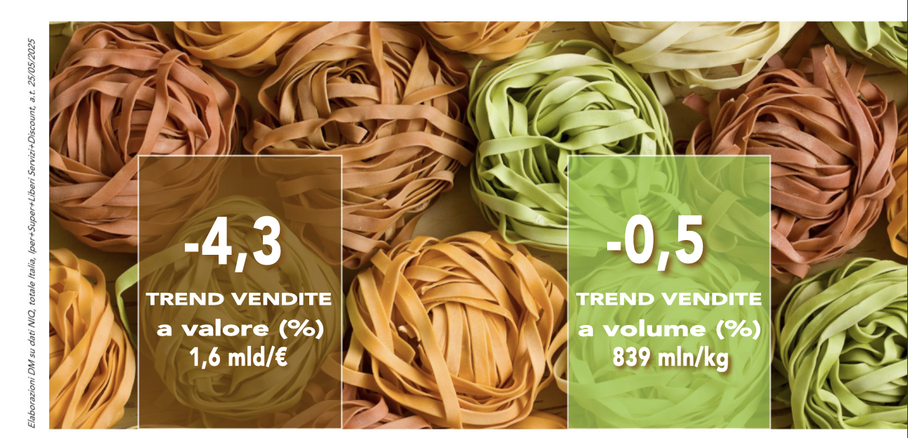 Nell’anno terminante il 25 maggio 2025, a totale Italia la categoria della pasta secca ha raggiunto un fatturato di oltre 1,6 miliardi di euro, segnando un calo del 4,3% rispetto all’anno precedente. Il comparto registra trend leggermente negativi anche per le vendite a volume (-0,5%) e a confezione (-0,3%), per un totale rispettivamente di 839 milioni di chilogrammi commercializzati e 1,55 miliardi di confezioni vendute. Il prezzo medio €/kg è calato del 3,7%, stabilizzandosi a 1,91 euro (dati NIQ, Iper+Super+Liberi Servizi+Discount).