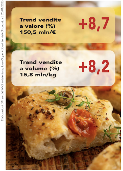 Il comparto, inteso come paniere di specialità morbide (focacce), pizze fresche, basi per pizza e preparati, nell’anno terminante a gennaio 2026 raggiunge in Italia un giro d’affari di 150,5 milioni di euro, segnando un ulteriore +8,7% sull’anno precedente dopo il +17,8 del 2024. A volume sono stati venduti oltre 15,8 milioni di chilogrammi, evidenziando una crescita del +8,2% (dati NIQ, totale Italia, Iper+Super+Liberi servizi+Discount).